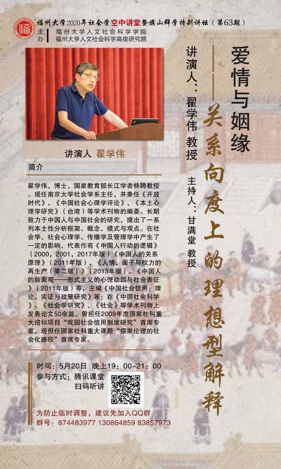 演讲人简介:翟学伟: 博士,国家教育部长江学者特聘教授。现任南京大学社会学系主任,并兼任《开放时代》、《中国社会心理学评论》、《本土心理学研究》(台湾)等学术刊物的编委。长期致力于中国人与中国社会的研究,提出了一系列本土性分析框架、概念、模式与观点。在社会学、社会心理学、传播学及管理学中产生了一定的影响,代表作有《中国人行动的逻辑》(2000,2001,2017年版)《中国人的关系原理》(2011年版)、《人情、面子与权力的再生产(第二版)》(2013年版)、《中国人的脸面观——形式主义的心理动因与社会表征》(2011年版)等,主编《中国社会信用:理论、实证与政策研究》等;在《中国社会科学》、《社会学研究》、《社会》等学术刊物上发表论文50余篇。曾担任2009年度国家社科重大招标项目“我国社会信用制度研究”首席专家,现担任国家社科重大课题“儒家伦理的社会化路径”首席专家。