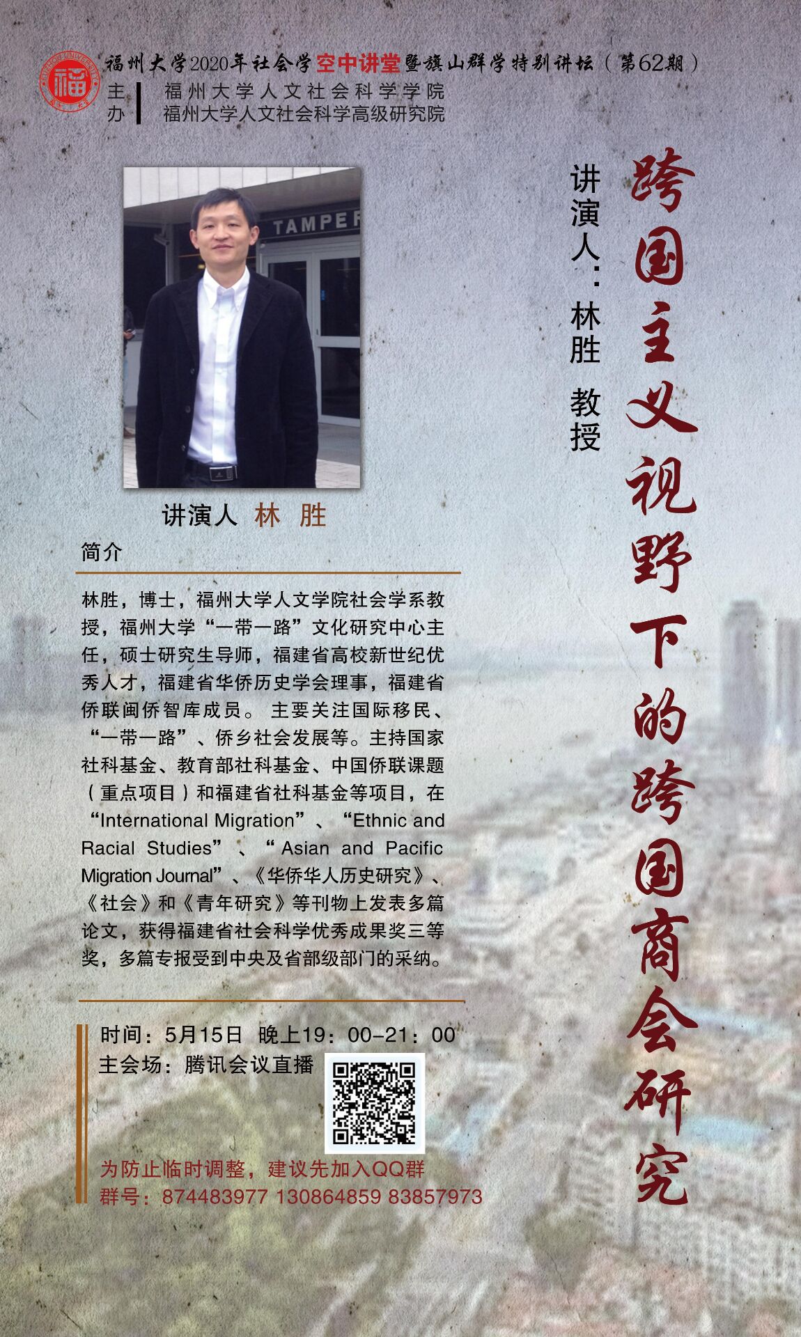 演讲人简介:林胜,博士,8040威尼斯最佳登录人文学院社会学系教授,8040威尼斯最佳登录“一带一路”文化研究中心主任,硕士研究生导师,福建省高校新世纪优秀人才,福建省华侨历史学会理事,福建省侨联闽侨智库成员。主要关注国际移民、“一带一路”、侨乡社会发展等。主持国家社科基金、教育部社科基金、中国侨联课题(重点项目)和福建省社科基金等项目,在“International Migration”、“Ethnic and Racial Studies”、“Asian and Pacific Migration Journal”、《华侨华人历史研究》、《青年研究》和《社会》等刊物上发表多篇论文,获得福建省社会科学优秀成果奖三等奖,多篇专报受到中央及省部级部门的采纳。