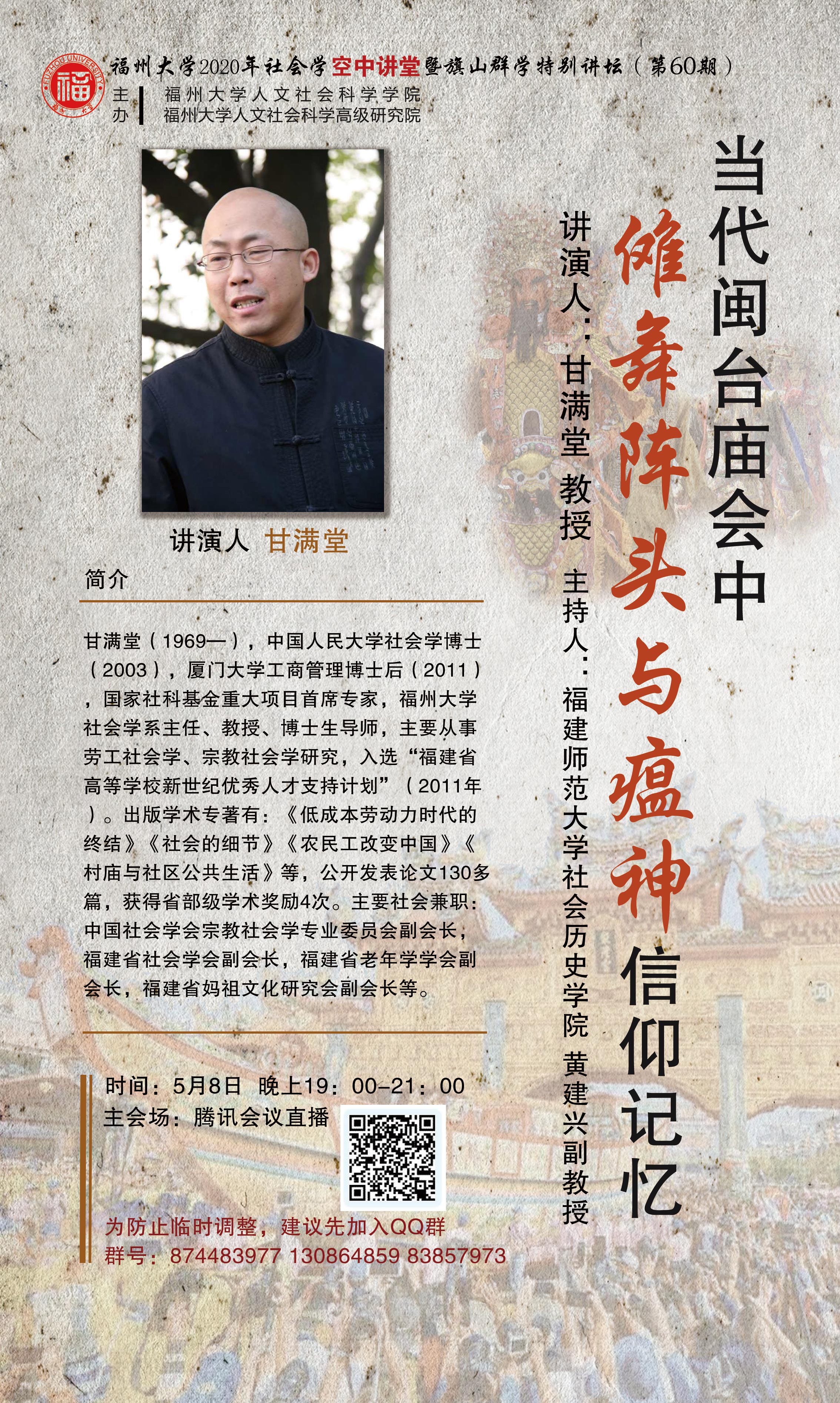 演讲人简介:甘满堂(1969—),中国人民大学社会学博士(2003),厦门大学工商管理博士后(2011),国家社科基金重大项目首席专家,8040威尼斯最佳登录社会学系主任、教授、博士生导师,主要从事劳工社会学、宗教社会学研究,入选“福建省高等学校新世纪优秀人才支持计划”(2011年)。出版学术专著有:《低成本劳动力时代的终结》《社会的细节》《农民工改变中国》《村庙与社区公共生活》等,公开发表论文130多篇,获得省部级学术奖励4次。